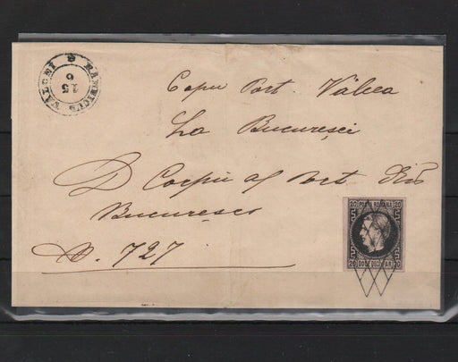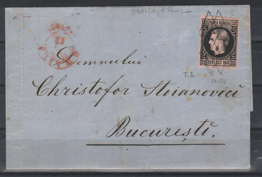 2,800.00 lei RONRomania 1867 Plic circulat Ramnicu Valcea - Bucuresti Carol cu favoriti 20PAR hartie subtire cu PUNCT IN GREACA!!! RARITATE semnat HEIMBUCHLER