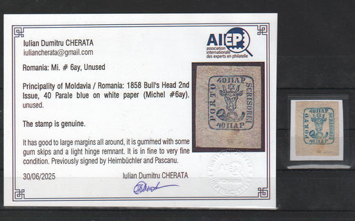 2,000.00 lei RONRomania 1858 Cap de bour emisiunea a II-a 40PAR albastru pe hartie galbuie, pe fragment, stampila intreaga JASSY MOLDOVA violet. Certificat autenticitate CHERATA, semnat PASCANU
