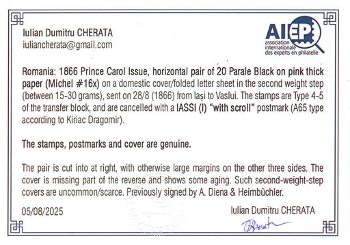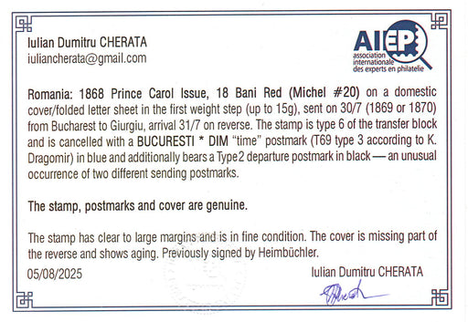 3,500.00 lei RONScrisoare francata Carol I cu favoriti 20PAR hartie groasa in pereche tip 4 si 5 (cu PUNCT IN GREACA!!!), text complet, sigiliu verso. Certificat CHERATA, semnat HEIMBUCHLER si DIENA. RARITATE!!! (citeste certificat)