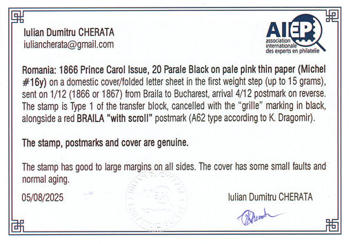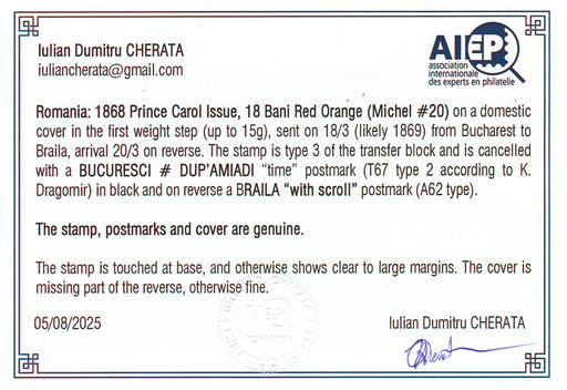 950.00 lei RONScrisoare francata Carol I favoriti 20PAR hartie subtire. Certificat autenticitate CHERATA (citeste pentru detalii)