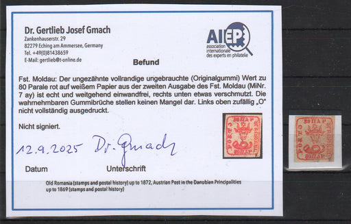 1,950.00 lei RONRomania 1859 Cap de bour emisiunea a II-a 80PAR rosu stampila BAKEU albastra certificat Dr. Gmach