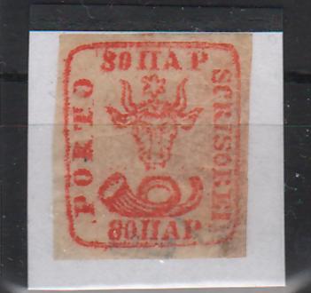 Pret original 4,800.00 lei RONPret curent 4,200.00 lei RONRomania 1859 Cap de bour emisiunea a II-a 80PAR rosu certificat Gmach poanson neidentificat