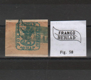 Romania 1858 Cap de bour emisiunea a II-a 40PAR albastru-verzui hartie galbuie tipar ancrasat, pe fragment, stampila FRANCO BERLAD. Certificat autenticitate CHERATA
