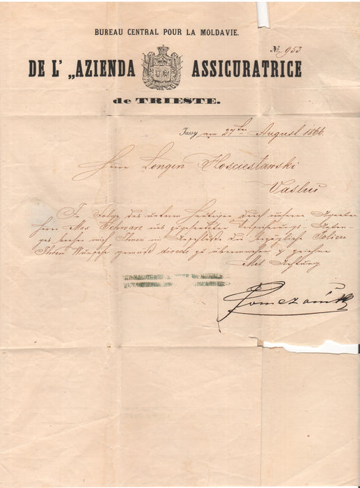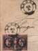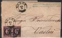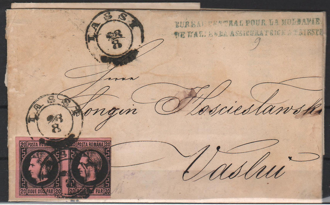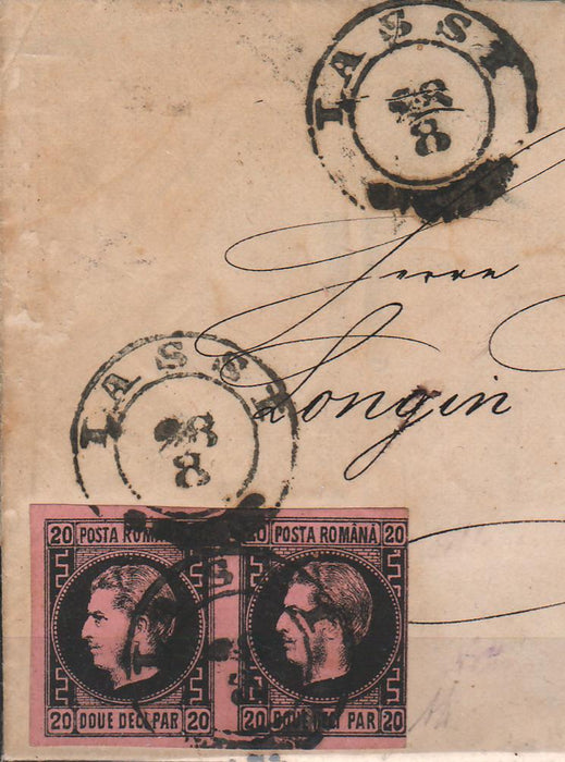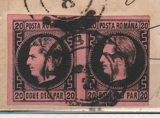 Scrisoare francata Carol I cu favoriti 20PAR hartie groasa in pereche tip 4 si 5 (cu PUNCT IN GREACA!!!), text complet, sigiliu verso. Certificat CHERATA, semnat HEIMBUCHLER si DIENA. RARITATE!!! (citeste certificat)